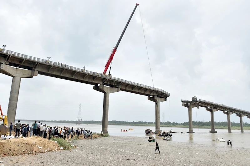 Gujarat'ın Vadodara bölgesinde 40 yıllık Gambhira köprüsünün bir kısmı çökmüş, köprüyü kullanan çok sayıda araç Mahisagar nehrine düşmüştü.