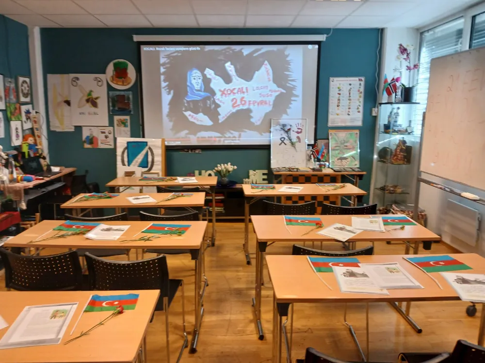 Oslo'da faaliyet gösteren Nizami Gencevi hafta sonu okulunun mevcut dersi Hocalı Faciası'nın 33. yıldönümüne adandı. Ders milli marşın söylenmesiyle başladı ve öğrenciler faciayı tasvir eden resimlerle ilgili bir film izlediler .