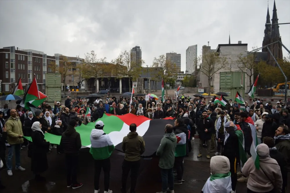 Hollanda'nın başkenti Amsterdam'da yüzlerce kişi, Filistin’e durmadan saldıran işgalcileri protesto etmek için bir araya geldi