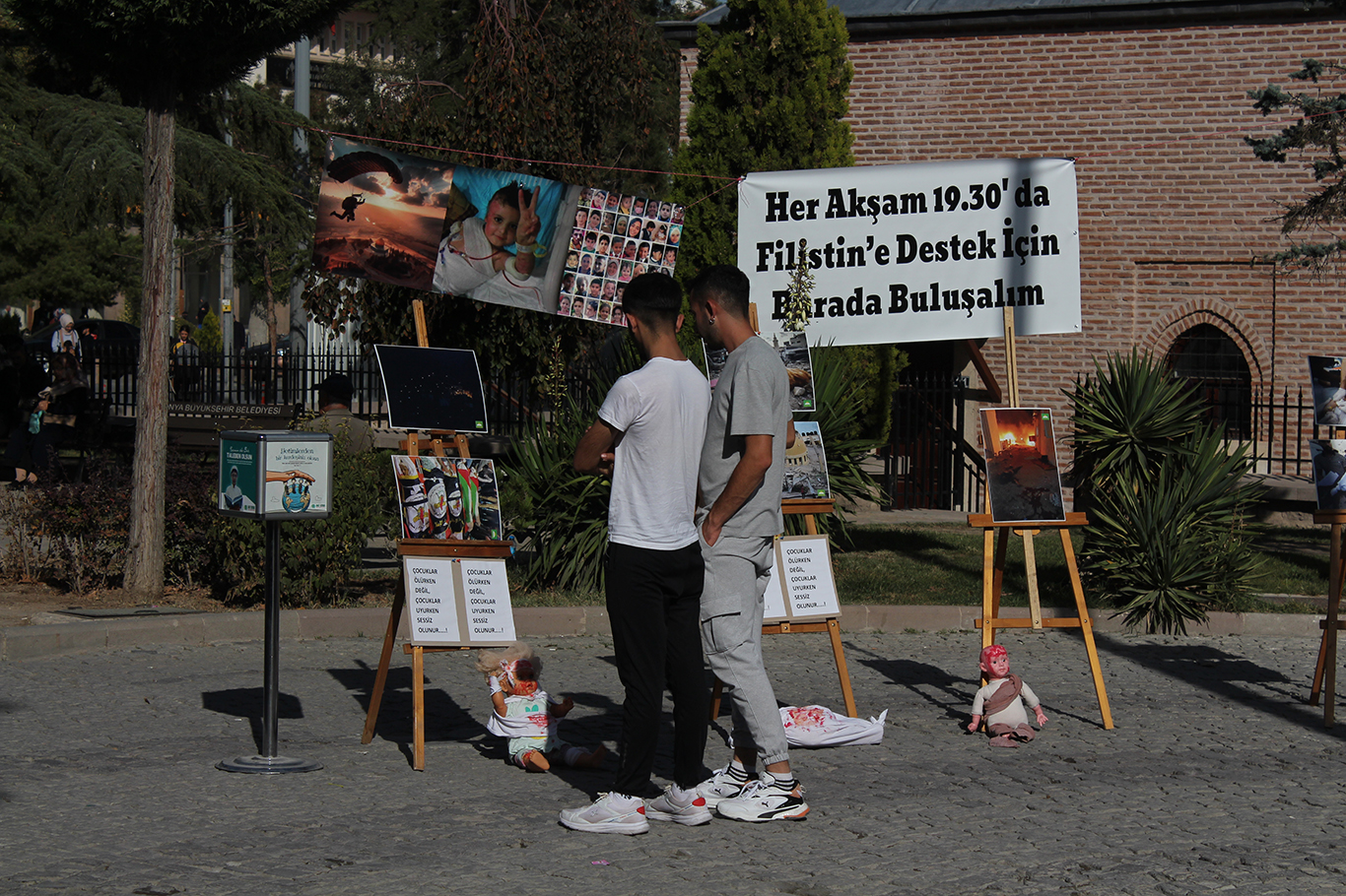 Gazze'deki siyonist işgalci rejimin katlettiği Filistinli şehitler için ve katliamların boyutunu halka göstermek amacıyla HÜDA PAR Konya İl Başkanlığınca resim sergisi düzenlendi.