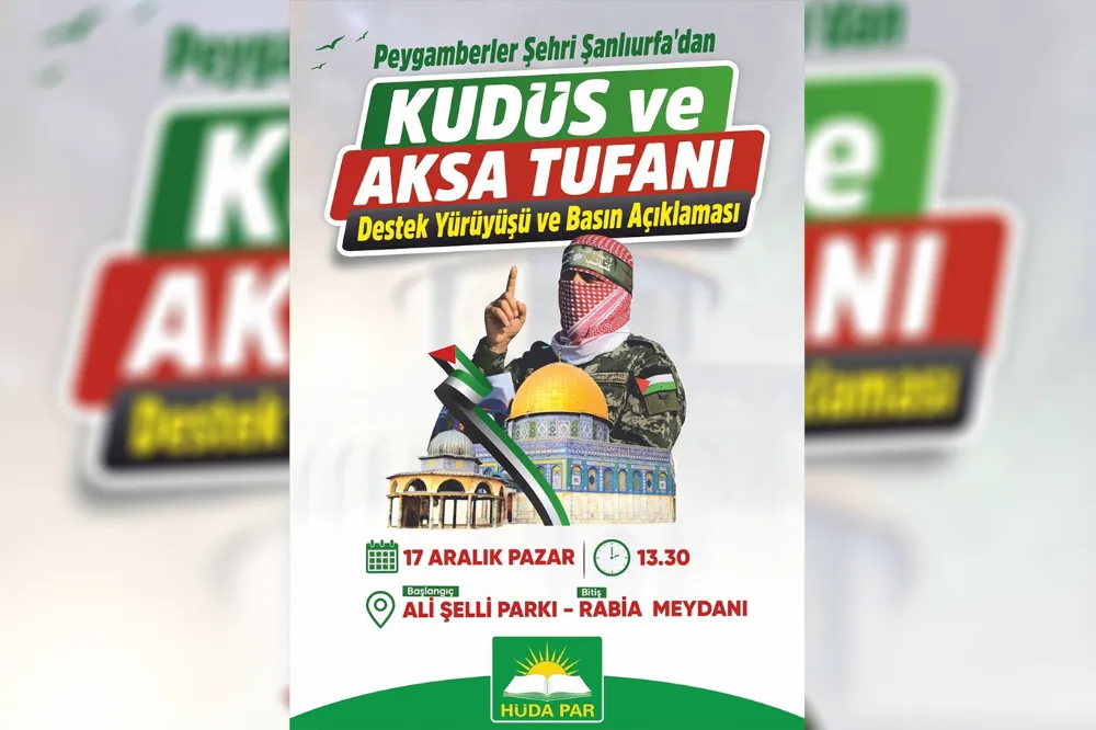 Her Cuma saat 11.11'de Şanlıurfa'nın bir sorununu ve bu soruna yönelik çözüm önerilerini paylaşan HÜDA PAR Şanlıurfa İl Başkanlığı, bu hafta Şanlıurfa'da yapılan etkinlik ve mitinglerde yaşanan sorunları dile getirerek Şanlıurfa'ya miting alanı yapılması ve 17 Aralık pazar günü yapılacak 'Kudüs ve Aksa Tufanı' mitingi için çağrı yaptı.