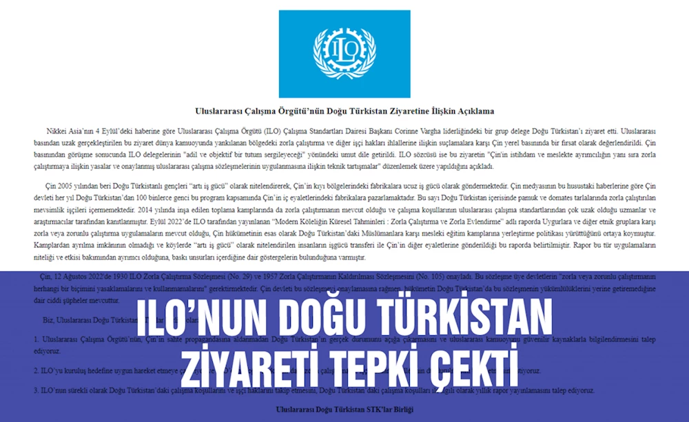 Uluslararası Doğu Türkistan STK’lar Birliği, Birleşmiş Milletler'in iştiraki olan Uluslararası Çalışma Örgütü'nün Doğu Türkistan'a yaptığı son ziyarete ilişkin yazılı basın açıklaması yayınladı.