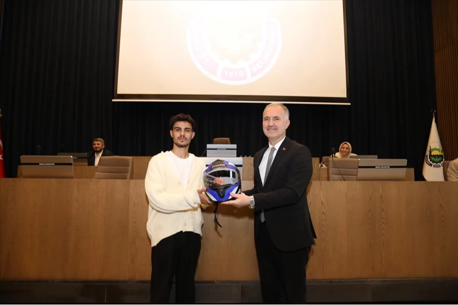 İnegöl’de motosikletiyle kırmızı ışıkta beklerken elindeki çöpü yere atmayarak cebine koyan ve bu örnek davranışı kent kameralarına yansıdıktan sonra Belediye Başkanı Alper Taban’ın sosyal medya hesaplarından paylaşarak teşekkür ettiği Enes Kaya isimli genç, İnegöl Belediye Meclisinde misafir edildi. Moto kurye olarak çalışan gence kask hediye edildi.