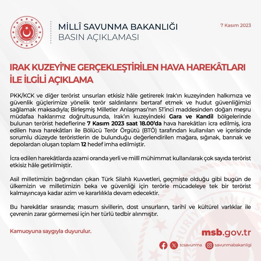 Milli Savunma Bakanlığı, sosyal medya hesabından yaptığı paylaşımda, "PKK/KCK ve diğer terörist unsurları etkisiz hâle getirerek Irak'ın kuzeyinden halkımıza ve güvenlik güçlerimize yönelik terör saldırılarını bertaraf etmek ve hudut güvenliğimizi sağlamak maksadıyla; Birleşmiş Milletler Anlaşması’nın 51’inci maddesinden doğan meşru müdafaa haklarımız doğrultusunda, Irak’ın kuzeyindeki Gara ve Kandil bölgelerinde bulunan terörist hedeflerine 7 Kasım 2023 saat 18.00’da hava harekâtları icra edilmiş, icra edilen hava harekâtları ile Bölücü Terör Örgütü (BTÖ) tarafından kullanılan ve içerisinde sorumlu düzeyde teröristlerin de bulunduğu değerlendirilen mağara, sığınak, barınak ve depolardan oluşan toplam 12 hedef imha edilmiştir." ifadelerini kullandı.