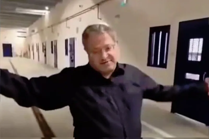 İşgalci Bakanın servis ettiği görüntüde, hapishanenin iç avlusu gösterilerek, avlunun duvarına asılı işgal paçavrasının üzerinde katliamın yapıldığı Gazze’nin yıkıntıları ve yıkıntılarının üzerinde yürüyen Gazzelilerin bulunduğu fotoğrafların asıldığı görülüyor. (İLKHA)