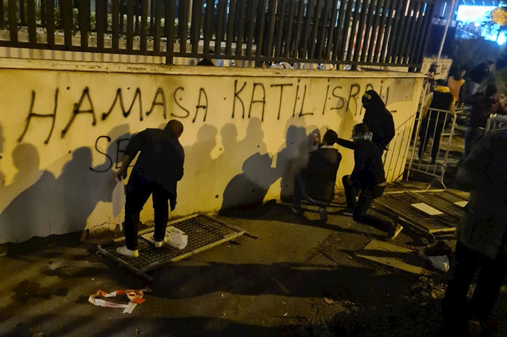 İşgal rejiminin akşam saatlerinde Gazze'de 2 farklı hastaneye hava saldırısı yapmasının ardından binden fazla Filistinli kadın, erkek, yaşlı ve çocuk şehit oldu. Yaşanan katliamı kınamak amacıyla işgal rejiminin İstanbul konsolosluğu önünde toplanan binlerce kişi, işgal rejimi aleyhine sloganlar atarak konsolosluğa girmeye çalıştı. Polisin müdahalesiyle yaşanan arbedede kimi vatandaşlar yaralanırken müdahaleye rağmen çok sayıda kişi konsolosluk binasına girmeyi başardı. Polis engelini aşan bazı vatandaşlar, işgal rejiminin konsolosluğunun bulunduğu binaya 'HAMAS'a Selam' ve 'Katil israil' sloganları yazdı.