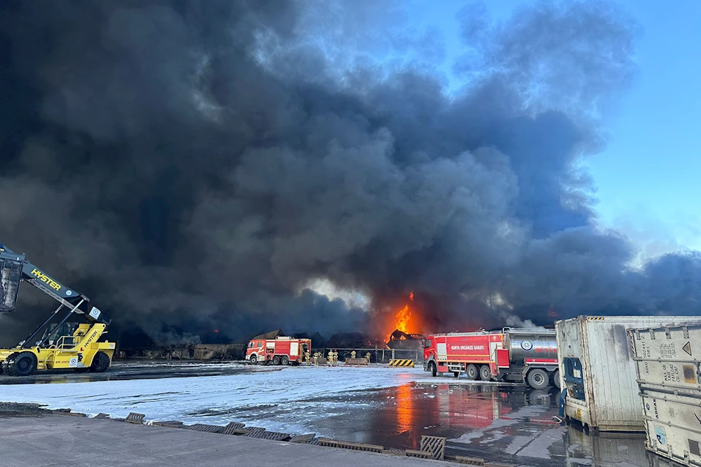 Hatay'da İskenderun Limanı'nda konteyner deposunda depremden sonra çıkan yangına havadan ve karadan müdahale ediyor.