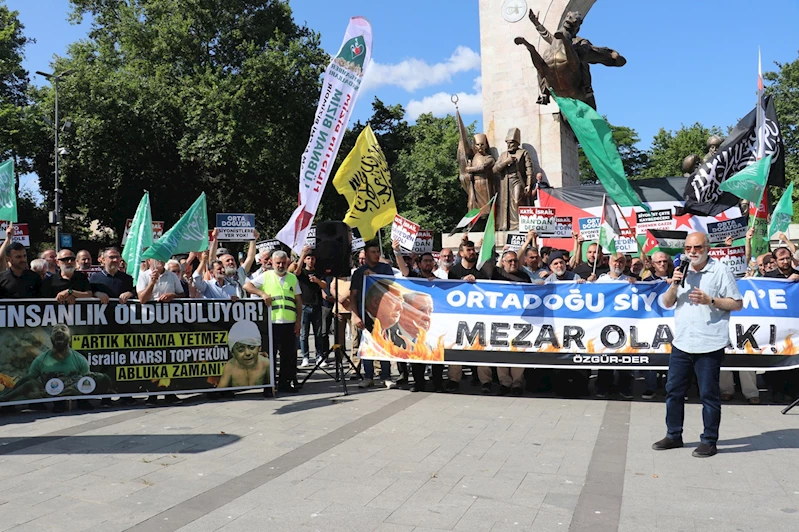 STK'lar adına basın açıklamasını okuyan Yasir Bayram, "Filistin halkına karşı Gazze'de tüm dünyanın gözleri önünde iki yıla yakın bir süredir tam tekmil bir soykırım icra eden Siyonist çete azgınlıkta sınır tanımıyor. Başta ABD olmak üzere Batılı emperyal güçlerin de desteğiyle Siyonist çete süreci giderek daha kaotik bir ortama dönüştürerek bölgesel tahakküm planları için bir fırsat olarak değerlendiriyor. Kudüs'te Mescid-i Aksa'ya yönelik provokasyonları özendiren, Batı Şeria'da yerleşimci adı verilen işgal sürülerinin yayılımını teşvik eden, Lübnan'a, Yemen'e, Suriye'ye yönelik sürekli bombardımanlara girişen işgal çetesi nihayet saldırganlığını İran'a da taşımış durumda." diye konuştu.