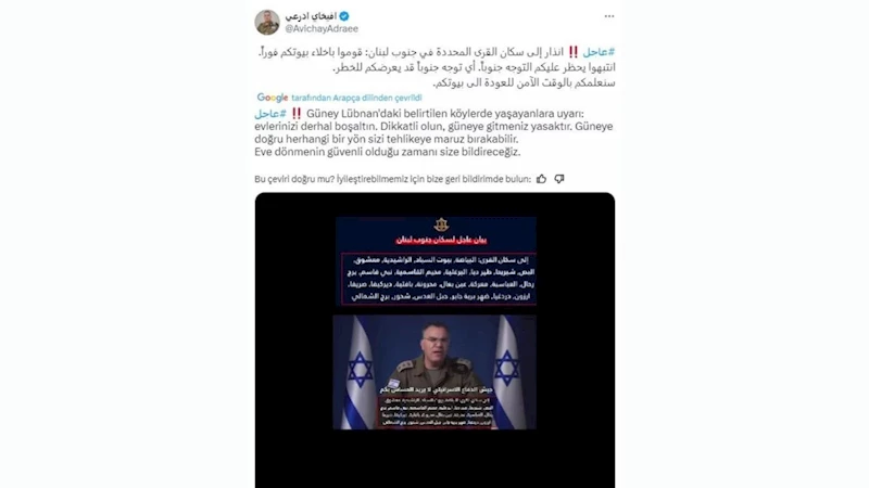 İsrail ordusu sözcüsü Avichai Adraee, sosyal medya üzerinden yaptığı açıklamada, bu bölgelerde yaşayan sivillerin derhal Avali Nehri’nin kuzeyine geçmeleri gerektiğini belirterek tahliye çağrısında bulundu.