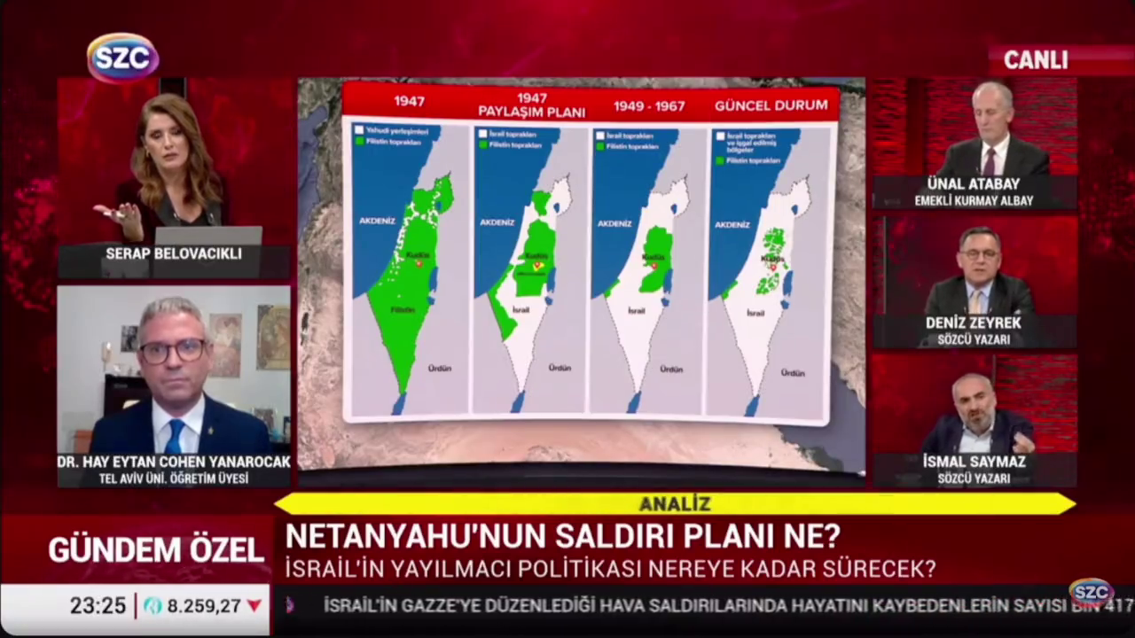 Tel Aviv Üniversitesi Öğretim Üyesi Eytan Cohen Yanarocak, Sözcü TV canlı yayınında şunları söyledi: “Biz bizi tanımayan bir entite ile nasıl bir ilişki içerisinde olmamızı bekliyorsunuz? Yani bize roket atana biz gül mü atalım? Bizim çocuğumuzu kesip biçeni, biz kesip biçmeyelim mi?”