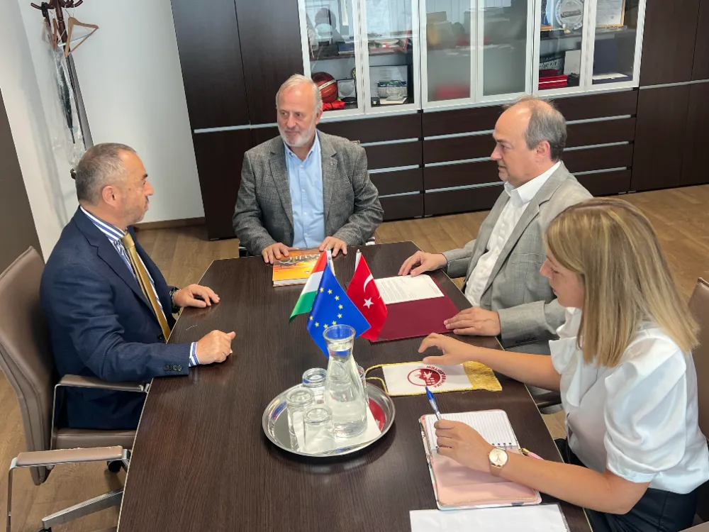 Başkan Attila Berlinger'in makamında gerçekleşen ziyarette, Başkan Yardımcısı Prof. Dr. György Fusz, Dış İlişkiler Sorumlusu Pinter Edina'da hazır bulunuyor.