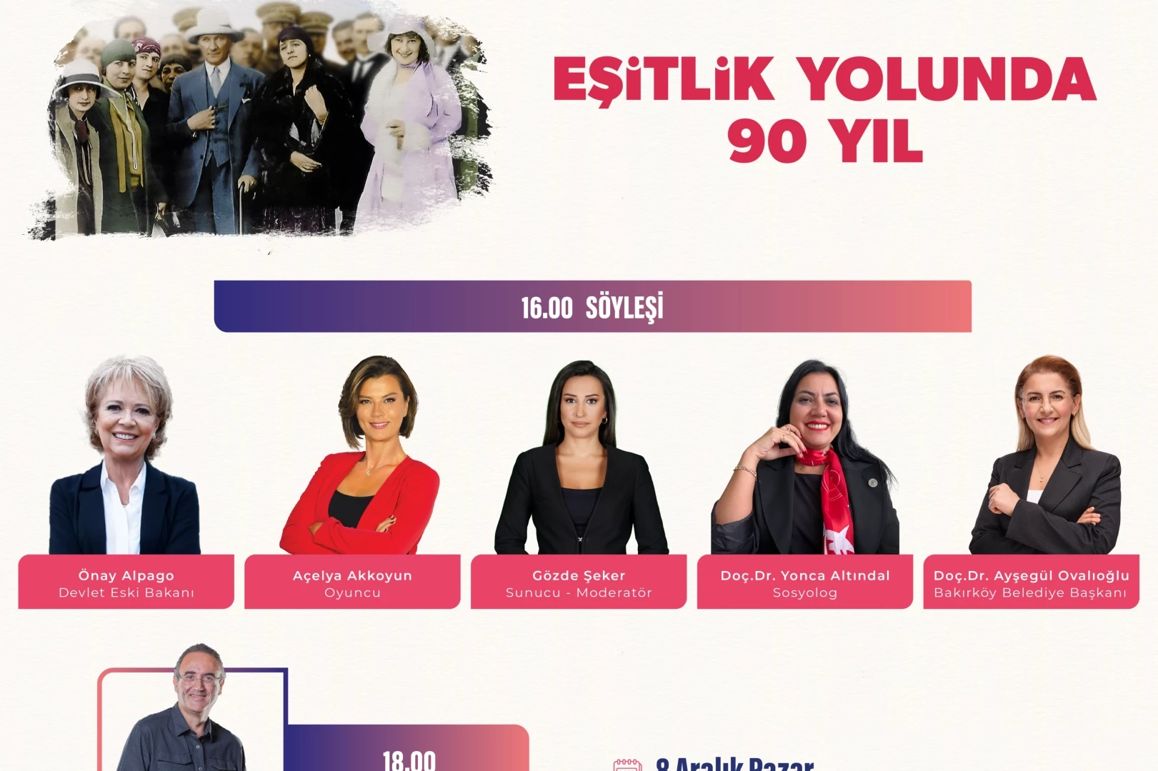 Bakırköy Belediyesi, her alanda eşitliğin sağlanması ve bu bilincin artırılması için çalışmalarını sürdürüyor. Türk kadınına seçme ve seçilme hakkının tanınmasının 90.yılı, Bakırköy’de anlamlı bir söyleşi ile taçlanacak. Söyleşiye Bakırköy’ün ilk kadın Belediye Başkanı Doç. Dr. Ayşegül Ovalıoğlu, Devlet Eski Bakanı Önay Alpago, Oyuncu Açelya Akkoyun, Sunucu-Moderatör Gözde Şeker ve Sosyolog Doç. Dr. Yonca Altındal konuşmacı olarak katılacak. Alanında uzman kadınların deneyimlerini aktararak eşit bir Türkiye için ilham kaynağı olacağı söyleşinin ardından, Sunay Akın bir anlatım gerçekleştirecek. Söyleşi programı, 8 Aralık Pazar günü saat 16.00’da Leyla Gencer Opera ve Sanat Merkezi’nde gerçekleştirilecek.