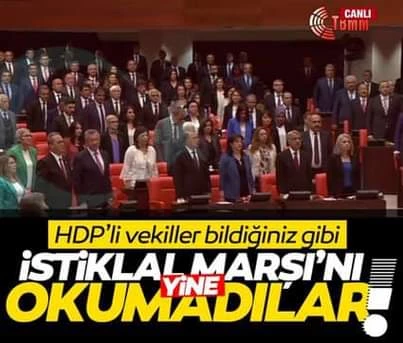 TBMM'nin yeni dönem açılışı sırasında saygı duruşu eşliğinde İstiklal Marşı okunurken, HDP'li vekiller İstiklal Marşı'nı okumadı. Sn. Genel Başkanımız Devlet Bahçeli, TBMM’nin yeni başkanıdır. Lütfen özel bir kanun veya tüzük maddesi çıkarılsın ve İstiklal Marşı’mızı okumayan hiç bir vekil bundan böyle TBMM birleşimlerine alınmasın. Grey Wolf