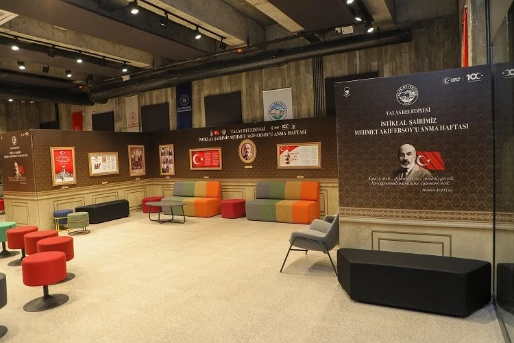 Mehmet Akif Ersoy’un hayatından kesitlerin ve Talas Belediyesi’nin Mehmet Akif konulu çalışmalarının yer aldığı sergide, Milli Şaire ait bazı şiirler de tablo olarak sunuluyor.