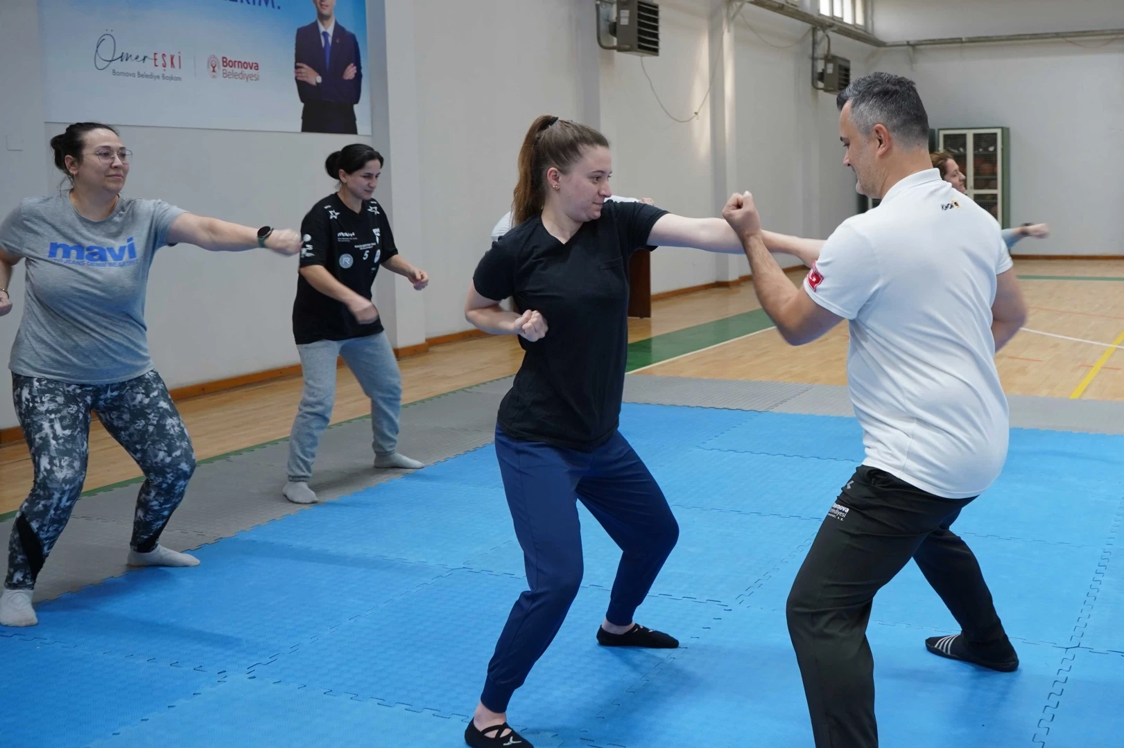 İzmir'de Bornova Belediyesi, kadınlara yönelik olarak düzenlediği savunma eğitimiyle temel savunma tekniklerini öğretiyor.