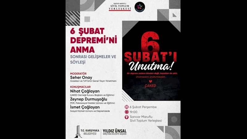 Etkinlik, 6 Şubat 2025 Perşembe günü saat 19:00’da Sancar Maruflu Sivil Toplum Yerleşkesi Konferans Salonu’nda gerçekleşecek. Programda, deprem anı ve sonrası yaşananlar, bugüne kadar yapılan çalışmalar ve dayanışma örnekleri ele alınacak.