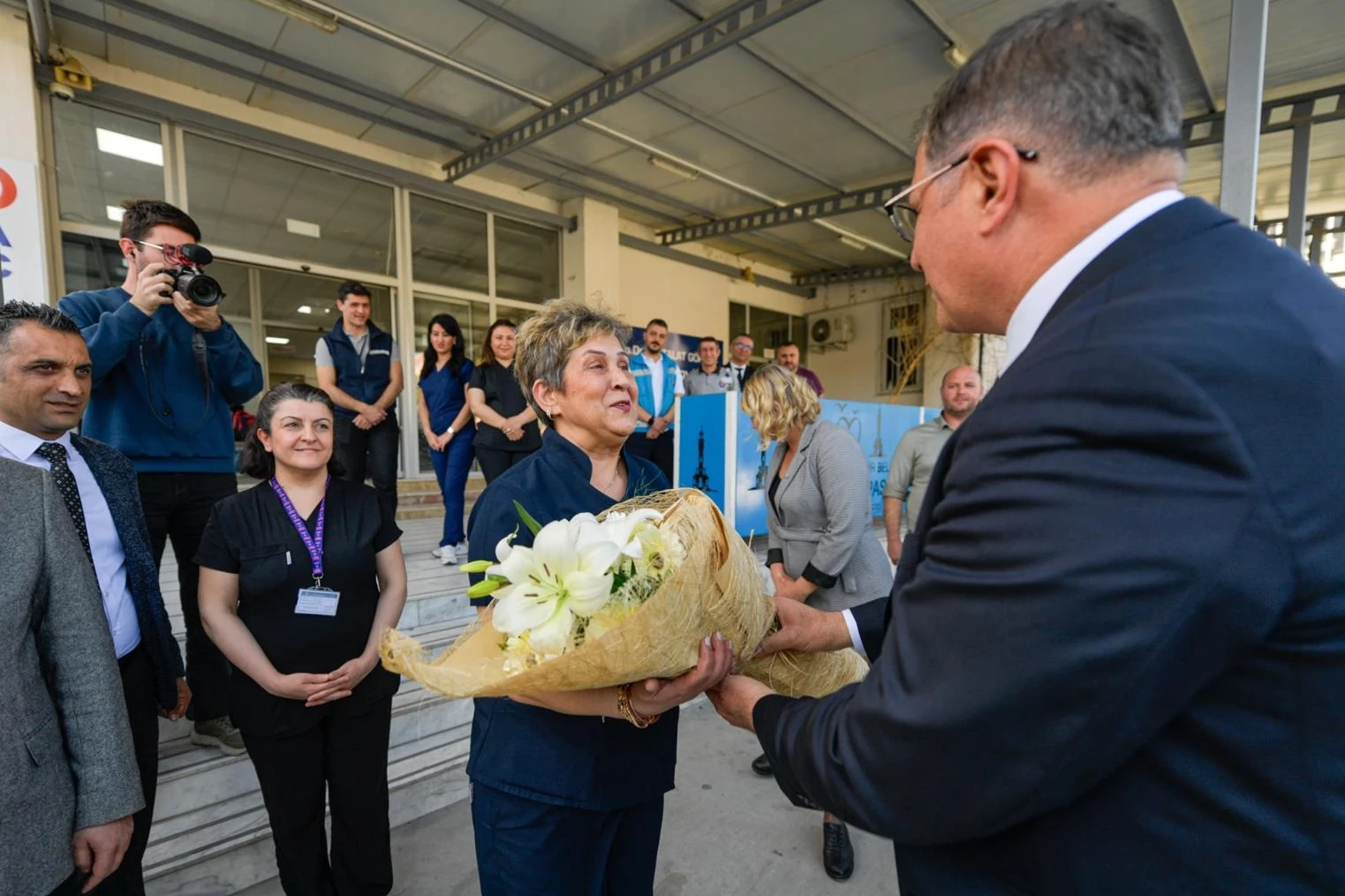 Ziyarette hastanenin en kıdemli üç hekimi Dr. İbrahim Kıyıcı, Dr. Melda Ongun Uçar ve Dr. Hüseyin Çetinel’e Başkan Tugay tarafından çiçek takdim edilerek, tüm çalışanlara karanfil dağıtıldı.