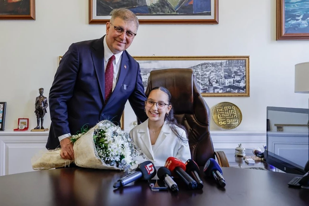 İZMİR (İGFA) - İzmir Büyükşehir Belediye Başkanı Dr. Cemil Tugay, Ulu Önder Gazi Mustafa Kemal Atatürk'ün dünya çocuklarına armağan ettiği 23 Nisan Ulusal Egemenlik ve Çocuk Bayramı'nda koltuğunu İzmir Çocuk Meclisi sözcüsü, Atakent Erdoğan Kibarer Ortaokulu 6. sınıf öğrencisi 12 yaşındaki Derin Taş'a devretti.