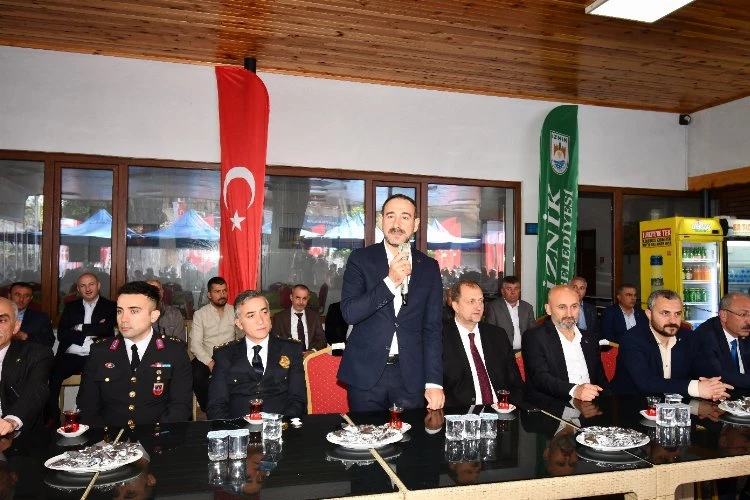 İznik Belediye Başkanı Kağan Mehmet Usta burada yaptığı konuşmada “Değerli Hemşerilerim, Rahmetin, bereketin ve şefaatin müjdelendiği, manevi duyguların en üst seviyede hissedildiği mübarek bir Ramazan ayını daha geride bırakarak, huzur içinde bayrama ulaşmanın mutluluğunu yaşıyoruz.Bayramlar, insanı insan yapan değerlerin yoğun olarak yaşandığı, dargınlıkların unutulduğu, sevgi ve saygının arttığı, herkesin birbirine hoşgörüyle baktığı en güzel zamanlardır.Hepimiz için büyük anlamlar taşıyan, birlik ve beraberliğimizi kuvvetlendiren, dostluk ve barış ortamı oluşturan bu bayramı, dargınlık ve küskünlüklerimizi unutarak, taşıdıkları anlam ve öneme uygun olarak kutlamalı, özellikle insanlık olarak kritik süreçlerden geçtiğimiz bu günlerde birbirimize ve ülkemize karşı sorumluluklarımızı daha çok hatırlamalıyız.Dünyanın farklı coğrafyalarında zulüm ve ızdırap altındaki kardeşlerimizin kurtuluşuna vesile olmasını Yüce Rabbim’den niyaz ediyorum.Bu duygu ve düşüncelerle; tüm vatandaşlarımızın Mübarek Ramazan Bayramını kutlar, Bayramın şehrimize, ülkemize, İslam âlemine ve tüm insanlığa, sağlık, huzur, mutluluk ve bereket getirmesini diler, sevgi ve saygılarımı sunarım” diye konuştu.