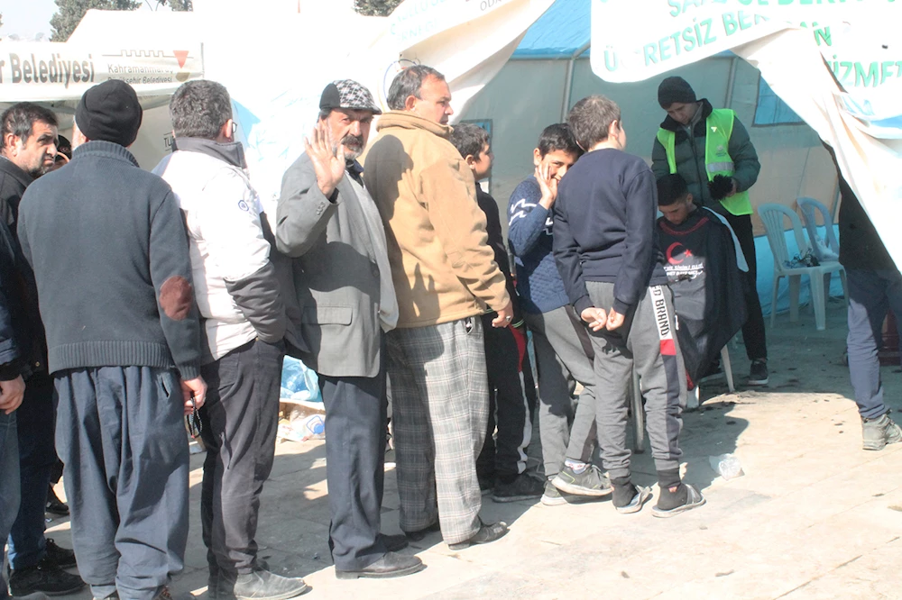 Sakarya'dan gelen gönüllü ekipler, Kahramanmaraş'ta depremzedeleri tıraş ediyor. Kurulan çadıra berber malzemelerini yerleştiren berberler, ücretsiz olarak tıraş ediyorlar. Tıraş olmak için gönüllü berber çadırlarının önünde uzun kuyruklar oluşur. İş yerinin depremden zarar görme yollarına yönelik Kahramanmaraşlı berber Mehmet Bayrakçı, Sakarya'dan gelen gönüllü berberlerle birlikte çalıştığını söyledi. Bayrakçı, “Kahramanmaraşlıyım. Sakarya ekibi burada gönüllü olarak tıraş ediyorlar. Onlarla tanıştım. Çalıştığımız yerde vardı. Depremden dolayı bazı malzemelerimiz gitti. Depremzedelere, insanlara destek için geldi. O kadar insanı kaybettik. Sabah geliyoruz, akşam geç vakitlere kadar buradayız. İnsanlarımız düşmüyorlar. Saçlarında kepekler oluşur. Buradan 71 ile sesleniyorum, destek çıksınlar. Ücretli ücretlendirme yapıyoruz. 300-400 TL'ye tıraş edildi duyumunu getirin.” diye konuştu.