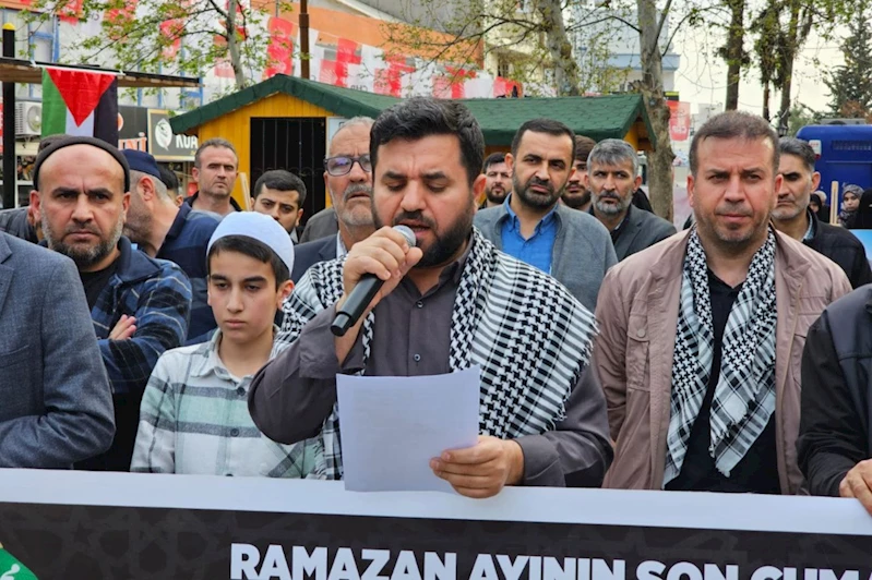Cuma namazı çıkışı toplanan kalabalık, Gazze'ye destek sloganları attı. Basın açıklaması Eşref Hüseyin Aktan'ın Kur'an-ı Kerim tilavetiyle başladı.