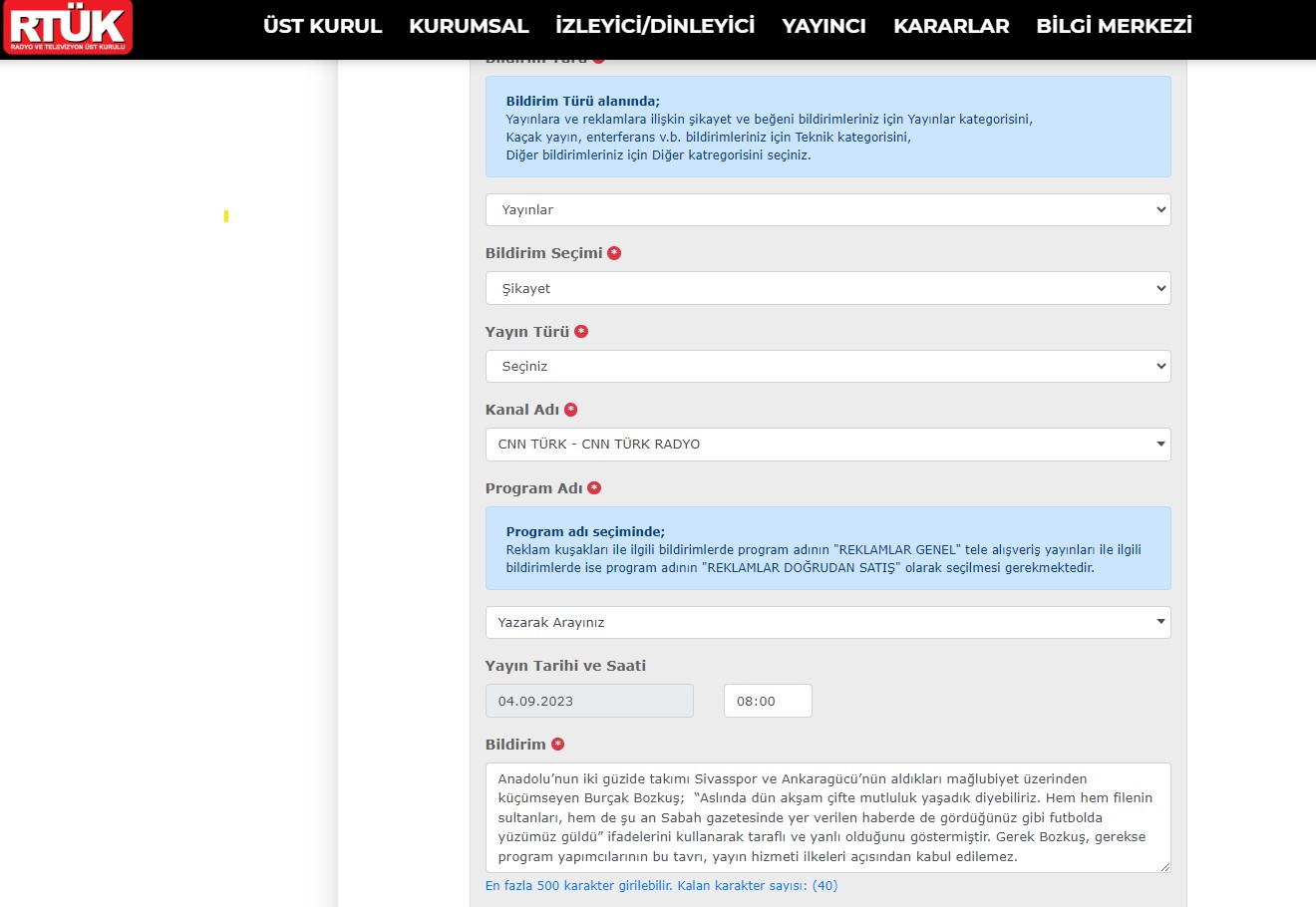 MES Televizyon ve Radyo Yayıncılık A.Ş’ye bağlı ve “CNN Türk” adı ve logosu ile yayın yapan yayın kuruluşunda 04.09.2023 tarihinde “Burçak Bozkuş ile A'dan Z'ye” adlı programda saat 08:47'de gazete haberlerini okurken son derce talihsiz beyanlarda bulunulmuştur.