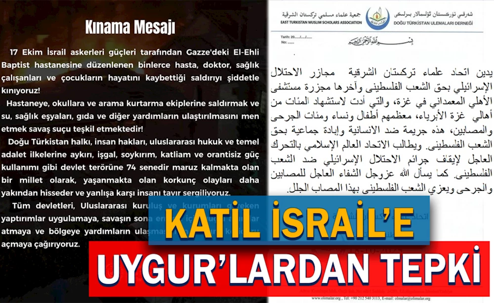 Doğu Türkistan Alimler Birliği, İsrail'in Filistin halkına yönelik katliamlarını ve Gazze'deki El-Memadani Hastanesi’nde aralarında çocuk ve kadınların da bulunduğu yüzlerce masum insanın ölümüne, yüzlercesinin de yaralanmasına yol açan katliam girişimini şiddetle kınıyoruz. Bu hiç şüphesiz bir insanlık suçudur ve Filistin halkına karşı işlenen bir soykırımdır.