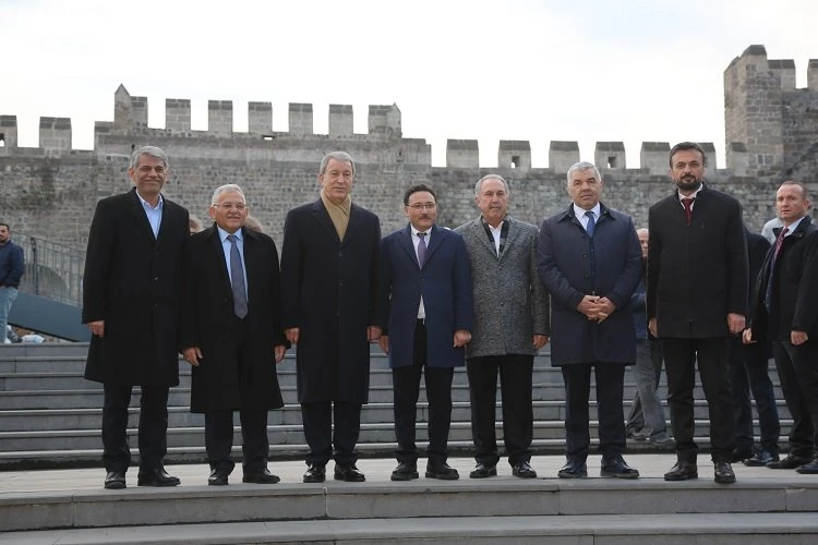 Kayseri Büyükşehir Belediye Başkanı Dr. Memduh Büyükkılıç, Milli Savunma Bakanı Hulusi Akar ile birlikte Kayseri Arkeoloji Müzesi’ni ziyaret ederek, tarihi Kayseri Kalesi’ne gelen vatandaşlarla sohbet etti. Mehmet UZEL (KAYSERİ İGFA) Bir dizi ziyaret için memleketi Kayseri’de bulunan Milli Savunma Bakanı Hulusi Akar, Büyükşehir Belediye Başkanı Dr. Memduh Büyükkılıç ile birlikte Kayseri Arkeoloji Müzesi’ni ziyaret etti. Arkeoloji Müzesi ve tarihi Kayseri Kalesi gezisinde Büykkılıç ve Akar’a Kayseri Valisi Gökmen Çiçek, Kültür ve Turizm Bakan Yardımcısı Nadir Alpaslan, İl Kültür Turizm Müdürü Şükrü Dursun, Türkiye Odalar ve Borsalar Birliği (TOBB) Rifat Hisarcıklıoğlu ve Kayseri Ticaret Odası Başkanı Ömer Gülsoy eşlik etti. Bakan Akar, müzede sergilenen eserleri ilgiyle incelerken İl Kültür Turizm Müdürü Şükrü Dursun, sergilenen eserlerle ilgili Büyükkılıç ve Akar ile beraberindekilere eserle ilgili bilgiler aktardı. Tarihi Kayseri kalesine gelen vatandaşların da ilgisi ile karşılaşan Başkan Büyükkılıç ve Bakan Akar, vatandaşlarla sohbet etti. Büyükkılıç ve Akar tarihi kale içerisinde günün anısına hatıra fotoğrafı çektirmeyi de ihmal etmedi.