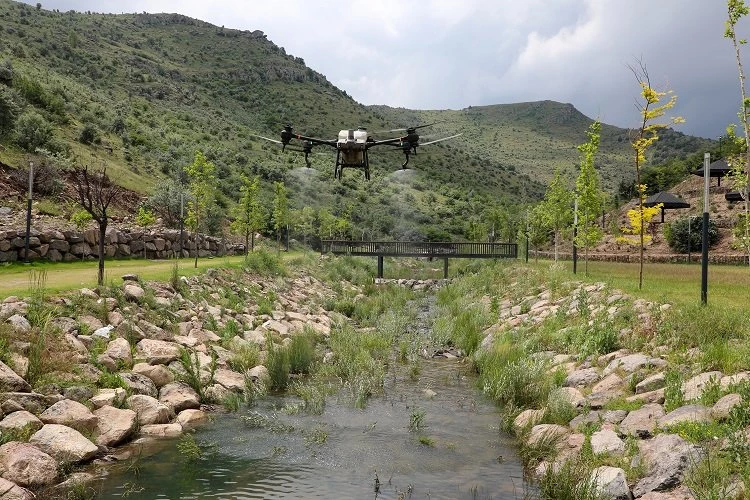 Bu yılın yaz başlangıcında açılışı gerçekleştirilen ve vatandaşların dinlenme ve piknik alanı olarak tercih ettiği ilk adresler arasında yer alan Kayseri'nin Talas ilçesine bağlı Zincidere 100. Yıl Mesire Alanı da drone ile ilaçlama uygulamasının ilk yapıldığı yer oldu.