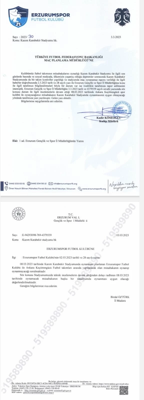 Kazım Karabekir Stadyumu’muzun yaşanan deprem felaketinden etkilendiği Çevre Şehircilik Bakanlığı yetkililerinin raporları sonucu tespit edilmiştir. Bu hafta oynayacağımız Keçiörengücü müsabakasının başka bir statta oynanması yönünde bilgilendirme Erzurum Gençlik ve Spor İl Müdürlüğü tarafından yazıyla tebliğ edilmiştir. Hasar durumu ve diğer gelişmeler Gençlik ve Spor Bakanlığı yetkililerinin incelemesi sonrası açıklanacak. Bu gelişme sonrasında Gençlik Spor Bakanlığı ve Türkiye Futbol Federasyonu ile yaptığımız görüşmeler neticesinde evimizde oynamamız gereken Keçiörengücü maçımızı zorunlu olarak Rize’de oynayacağız. Rizespor Kulübü başkanı İbrahim Turgut’a ve Rizespor Kulübü’ne teşekkür ediyoruz. Stadyum mevzusunun kulübümüz ve şehrimiz için çok önemli olduğunun altını çizerek bu konuda gereken hassasiyeti tüm paydaşlardan beklediğimizi ifade ederek, Erzurumspor Kulübü olarak tüm süreci titizlikle takip edeceğimizi camiamızla paylaşıyoruz.