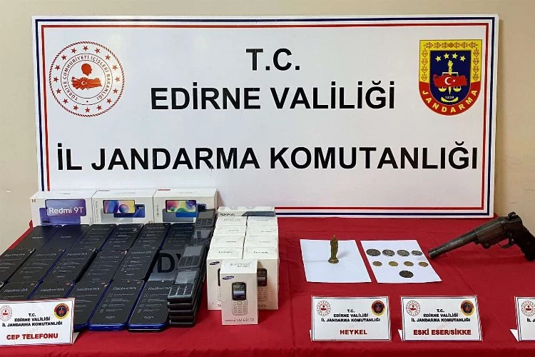 Erdoğan DEMİR / EDİRNE (İGFA) - Edirne İl Jandarma Komutanlığı, sorumluluk bölgesi içerisinde kaçakçılık olaylarına yönelik sürdürdüğü çalışmalarda Keşan İlçe merkezinde ikamet eden E.S. isimli şahsın ev ve eklentilerinde yapılan aramada 56 adet kaçak cep telefonu, 9 adet tarihi eser sikke, 1 adet tarihi eser heykel, 1 adet tabanca ve 20 adet kaçak cep telefonu bataryası ele geçirildi.