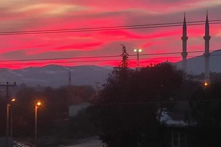 Bursa'nın Orhaneli ilçesinde gökyüzü kırmızıya döndü. Vatandaşlar tedirgin oldu.