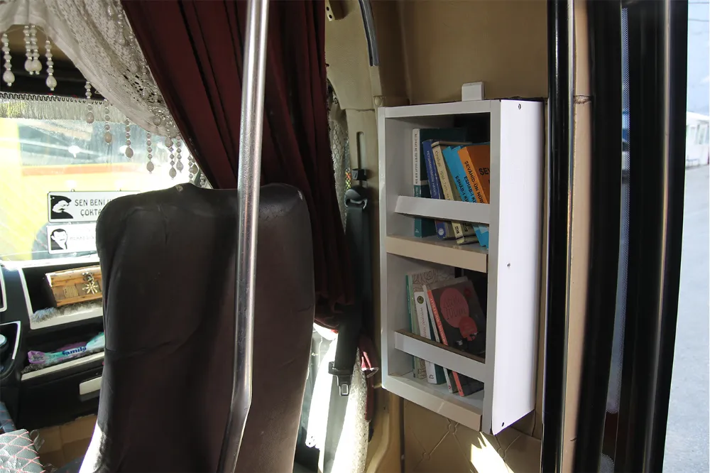 Minibüsün giriş kapısına küçük bir kitaplık kuran Gül, yolcuların kitap okumasını sağlıyor.