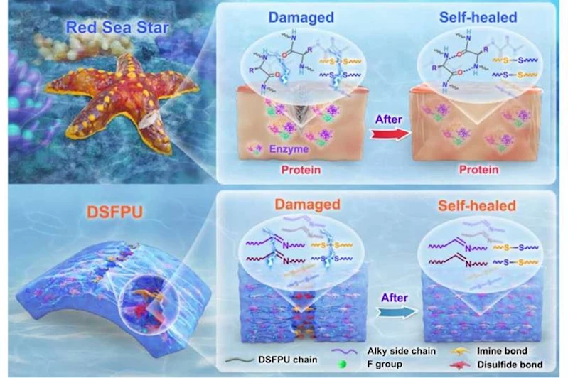 Araştırma ekibi, kızıl deniz yıldızlarının su altında fibrinolitik enzim salgılayarak kendilerini yenileme yeteneğinden ilham alarak, oda sıcaklığında suyun altında kendini onarabilen bir poliüretan tasarladı.