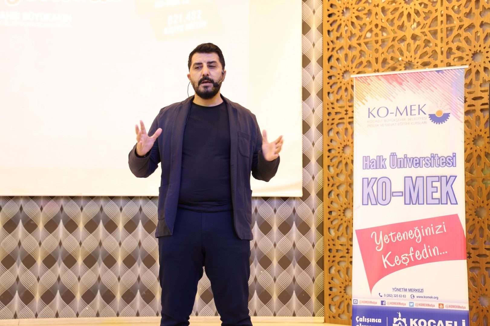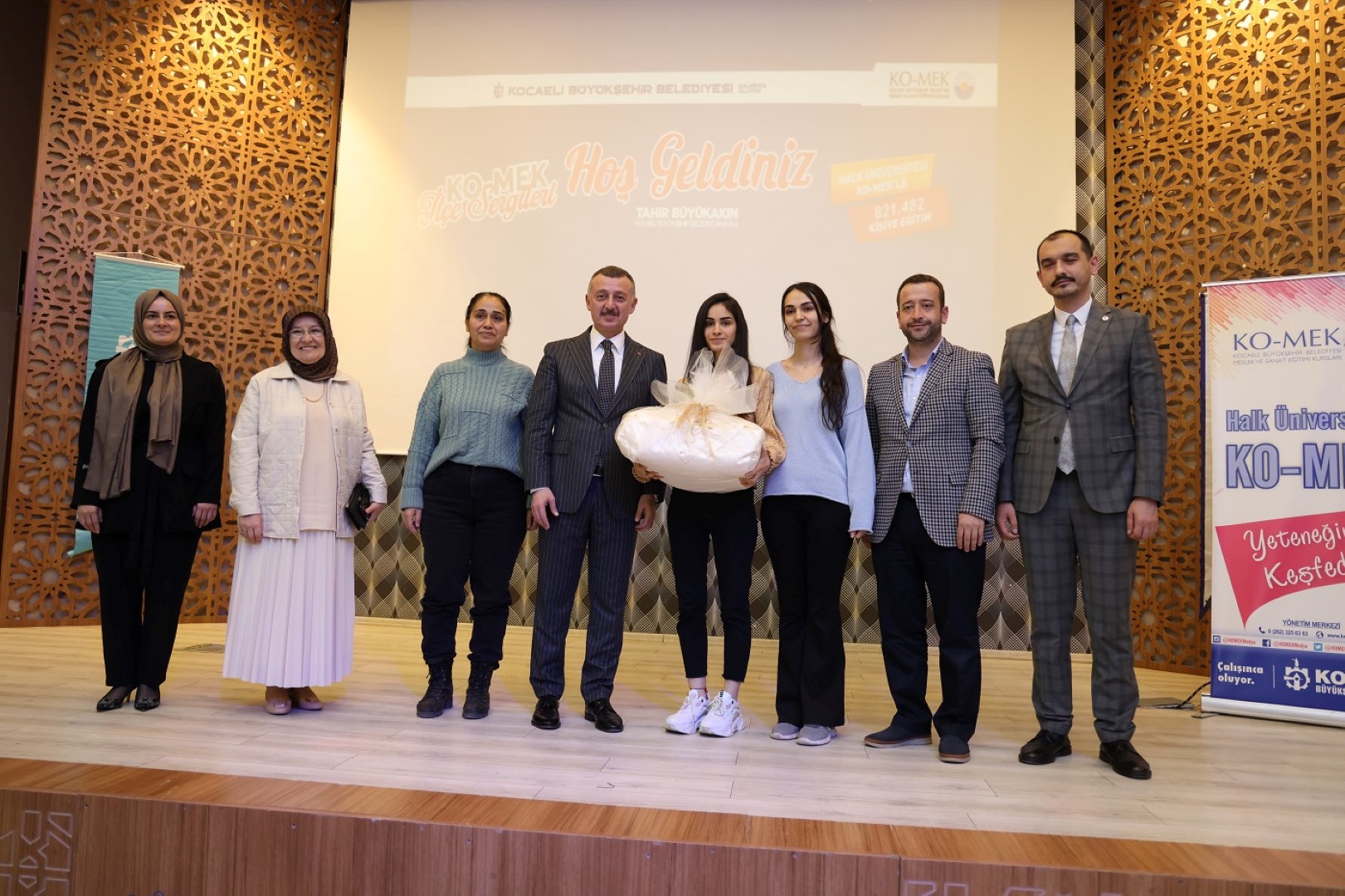 Söyleşinin ardından saygı duruşu ve istiklal marşının okunması ile başlayan programda kursiyerler adına Yahya Kaptan Kurs Merkezi takı tasarım kursiyeri Belma Emeksiz konuşma yaptı. Emekli olduktan sonra kendisini boşlukta hissettiğini belirten Emeksiz, ‘’KO-MEK benim için ikinci bir hayat oldu. Burada öğrendiklerimle adeta kendime emeklilik sonrası ikinci meslek edindim. Bize bu imkanı sağlayan Başkanımız Büyükakın’a ve ekip arkadaşlarına çok teşekkür ediyoruz’’ ifadesini kullandı.