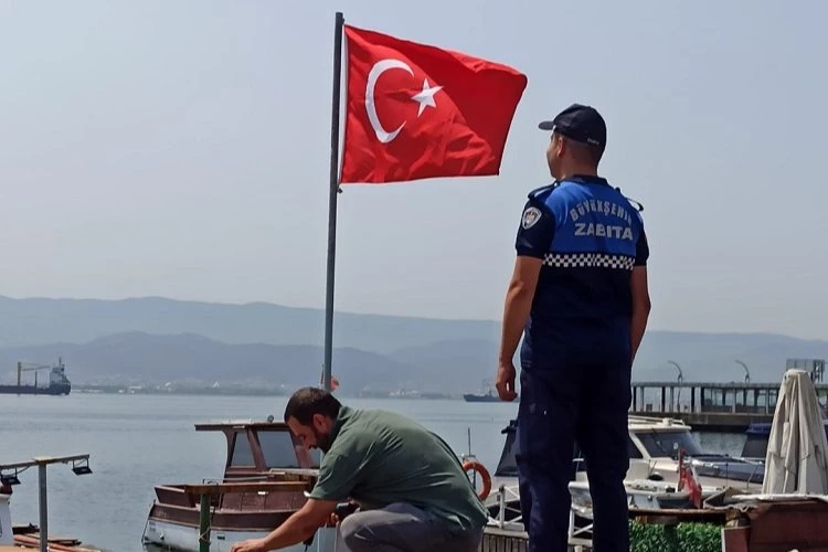 Kocaeli Büyükşehir Zabıtası, İzmit’te eski balık halinin bulunduğu alanda asılı bulunan bayrağın renklerinin solduğunu görünce yenisiyle değiştirdi