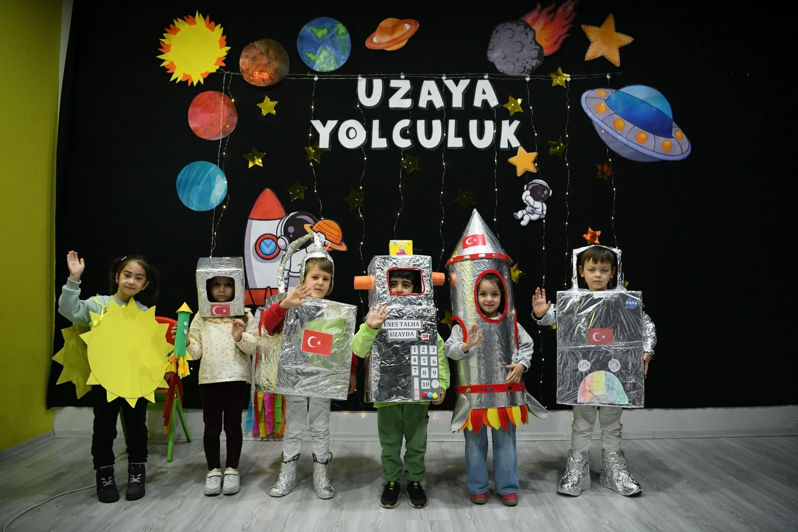 Kocaeli Çayırova Belediyesi Çocuk Kulübü’ndeki minikler, birçok farklı alanda, eğlenerek öğrenmeye devam ediyor. Son olarak Atatürk Çocuk Kulübü’nde eğitim alan Çayırovalı çocuklar, ‘Uzaya Yolculuk’ etkinliğinde velileriyle birlikte astronot kıyafetleri, gezegenler, roketler vb. materyaller yaptı.
