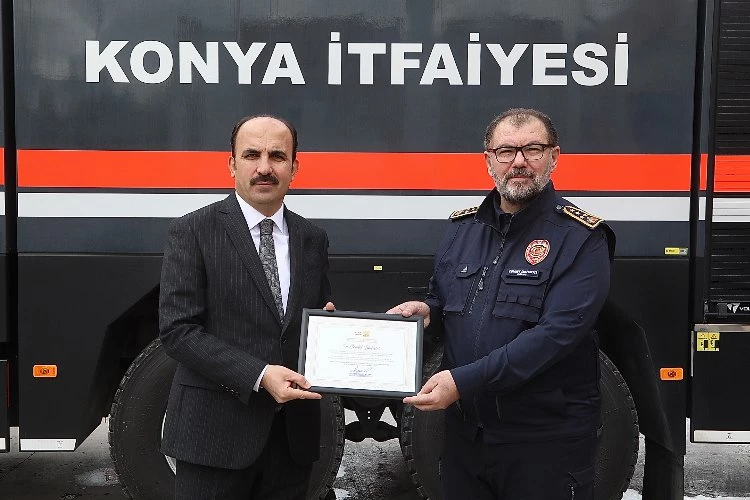 Konya Büyükşehir Belediye Başkanı Uğur İbrahim Altay, deprem sonrası Hatay’da görev yapan ve enkazdan 168 vatandaşın kurtulmasına vesile olan Konya İtfaiyesi personeline teşekkür belgelerini takdim etti.