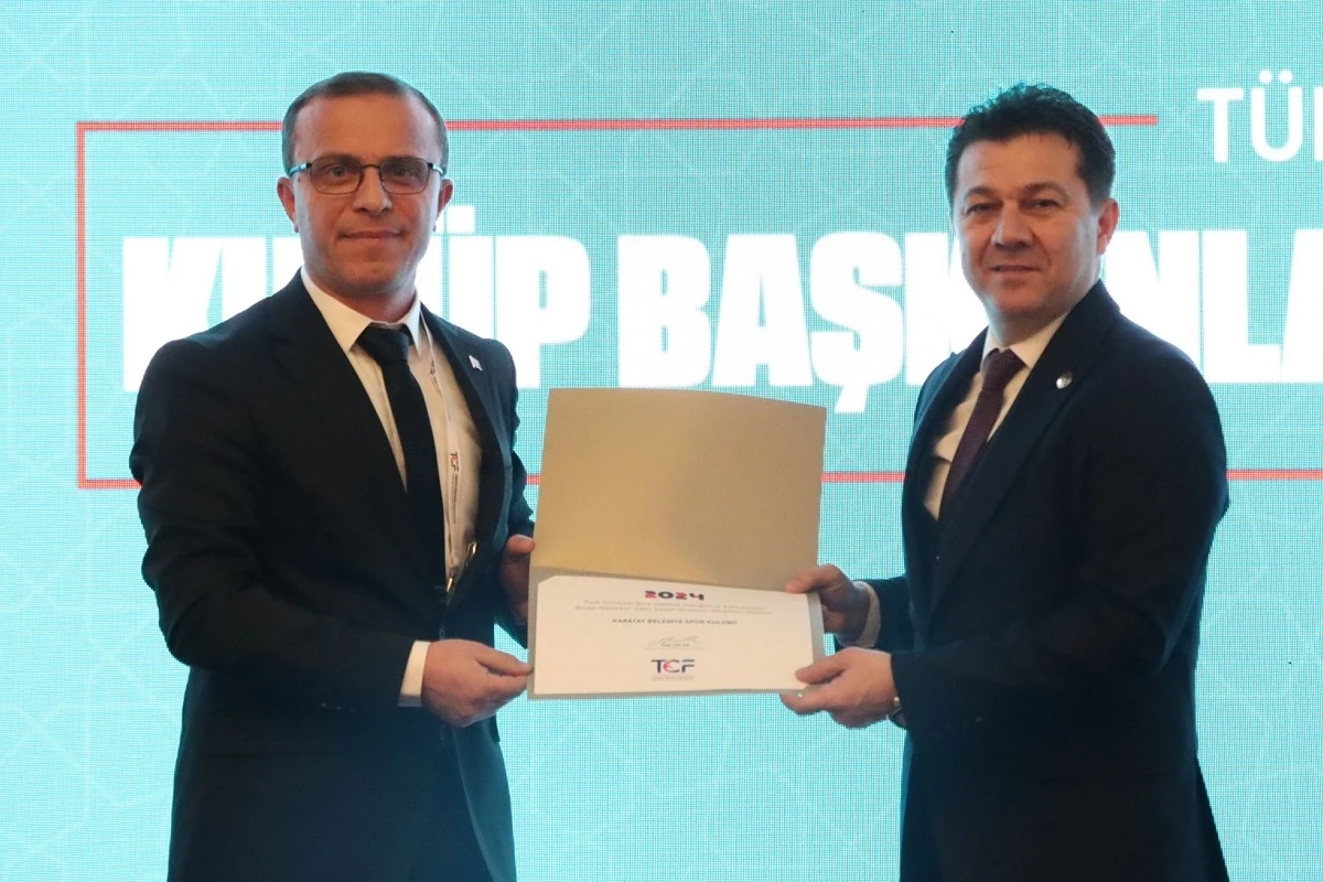Karatay Belediyespor Kulübü de bu kapsamda Antalya’da gerçekleştirilen Kulüp Başkanları ve İl Temsilcileri Toplantısı’nda ödüle layık görüldü. Kulüp adına ödülü, Karatay Belediyespor Kulübü Başkanı Muhittin Şener Türkiye Cimnastik Federasyonu Başkanı Suat Çelen’ten aldı.