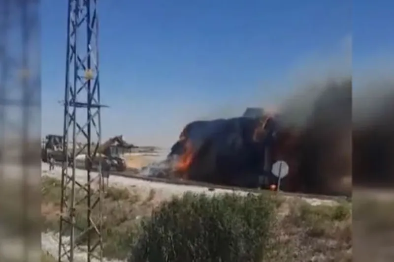 Konya’nın Karapınar ilçesinde 25 ton saman yüklü bir tır, park halindeyken çıkan yangında tamamen yandı.