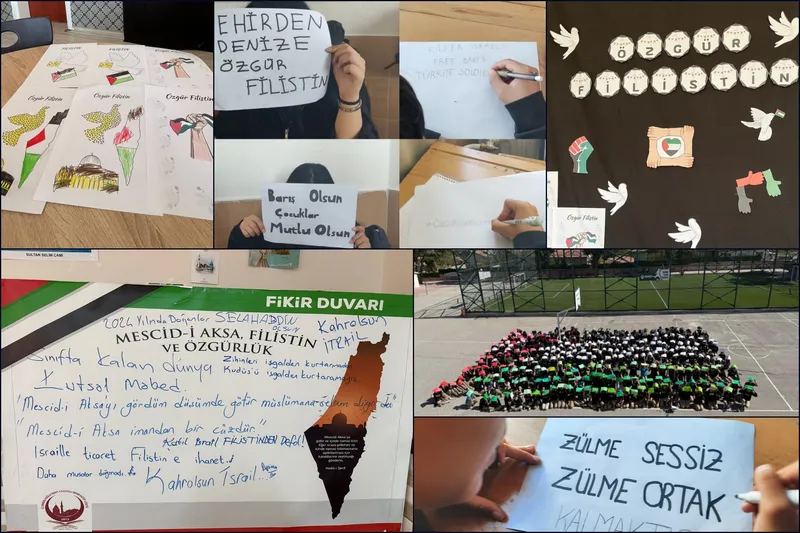 Sınıflarda Filistin bayrakları dalgalanırken, öğrenciler pankartlar ve bildirilerle Gazze halkına destek mesajı verdi. (İLKHA)