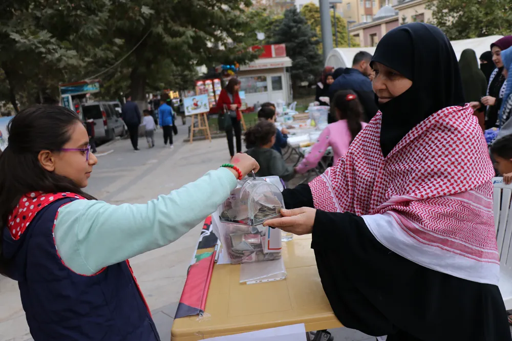 Yetimler Vakfı Malatya Temsilciliği tarafından Merkez Battalgazi ilçesi Karagözlüler Camii bahçesinde “Gazze’ye Acil Yardım” sloganıyla açılan kermes ve resim sergisindeki yardım standına gelen Ebrar Yıldırım, kumbarasındaki harçlıklarını Yetimler Vakfı aracılığıyla Gazze’ye bağışladı.