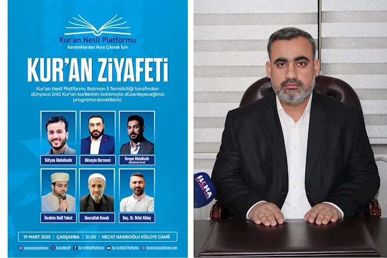 Her yaştan Batman halkını bu anlamlı geceye davet ettiklerini belirten Üzümcü, "Kur'an Nesli Platformu Batman Koordinatörlüğü olarak, yine bu gaye ile 19 Mart Çarşamba akşamı Esentepe Necat Nasıroğlu Külliye Camii'nde teravih namazını müteakiben, dünyaca ünlü Kur'an karîlerinin katılımıyla bir Kur'an ziyafeti programı düzenliyoruz inşallah. Bu programa yediden yetmişe tüm Batman halkını davet ediyor, Rabbimizden bizlere Kur'an'i çizgide bir yaşam nasip etmesini niyaz ediyoruz." dedi. (İLKHA)