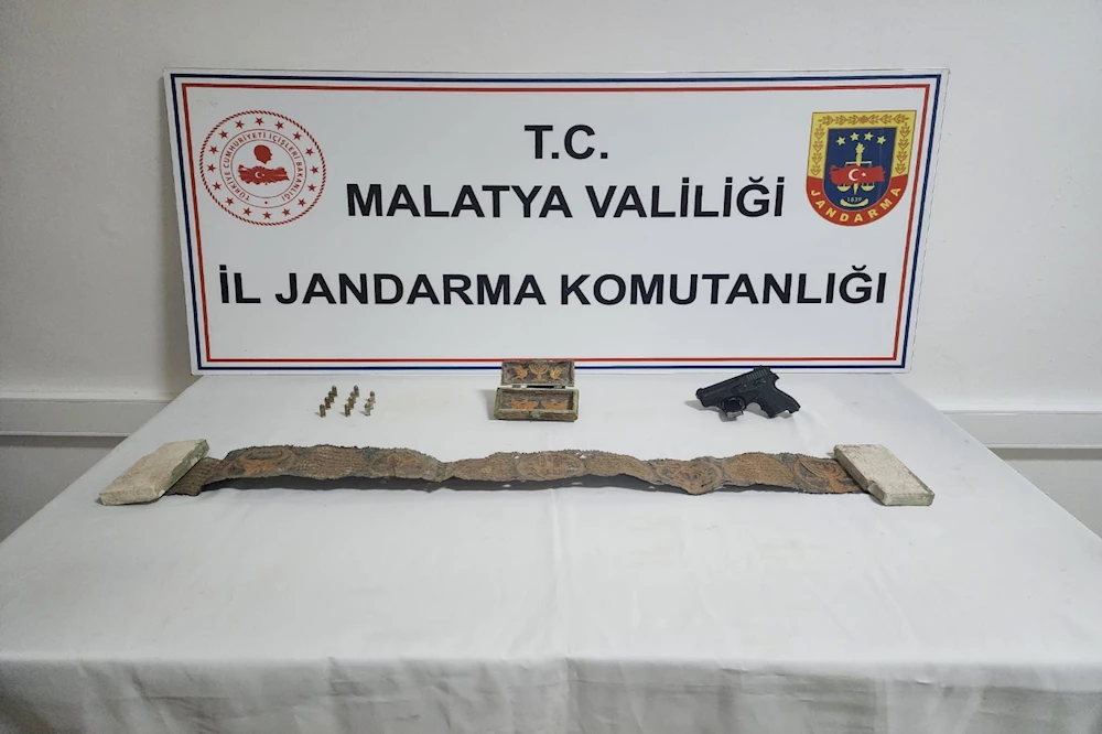 Yazıhan ilçesinde durdurulan araçta, tarihi değeri bulunan ahşap sandık ve içerisinde 1 adet Mısır dönemine ait 3 bin 500 yıllık olduğu değerlendirilen ceylan derisi üzerine altın varak işlemeli İbranice yazılı parşömen ve bir adet tabanca ele geçirilirken, 2 şüpheli şahıs yakalandı.