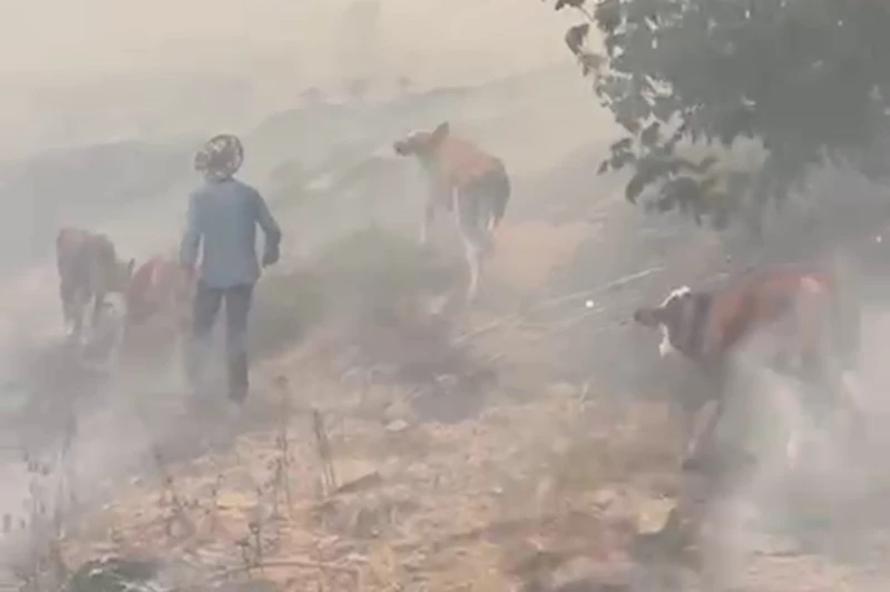 Hayvanlar güvenli alanlara alınırken, çevredeki vatandaşlar da söndürme çalışmalarına destek verdi.