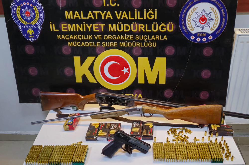 Yapılan eşzamanlı aramalarda; 1 adet ruhsatsız tabanca ve tabancaya ait şarjör, 2 adet ruhsatsız tüfek ile 606 adet fişek ele geçirildi.