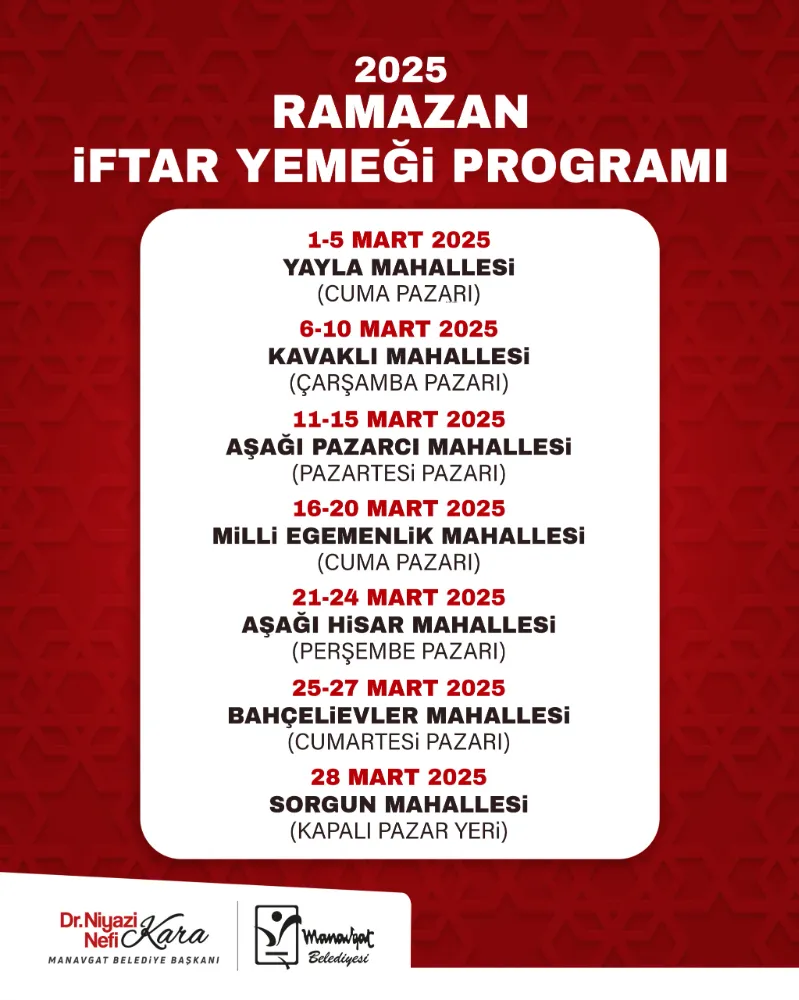 Manavgat Belediyesi, Ramazan Ayı boyunca farklı mahallelerde kuracağı iftar sofralarıyla binlerce vatandaşı buluşturmaya devam edecek. İşte iftar programlarının tarih ve lokasyonları: