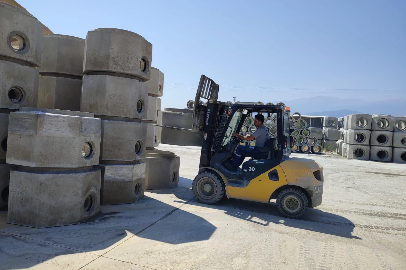 Manisa Büyükşehir Belediyesi'nin Salihli'deki beton parke, bordür ve boru üretim fabrikası, 24 saat kesintisiz bir üretim yaparak şehre katkı sağlıyor.