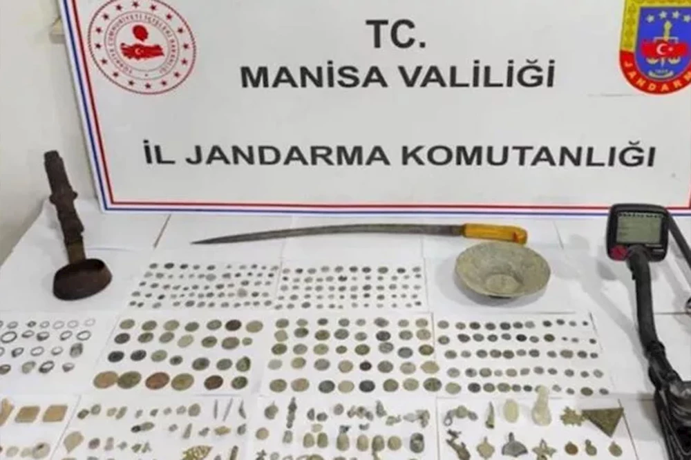 Manisa'nın Şehzadeler ilçesindeki jandarma ekipleri, tarihi eser kaçakçılığı istihbaratı üzerine bir akşam baskın ele geçirildi. Evde yapılan aramalarda 290 adet Doğu Roma Dönemi'ne ait sikke, 220 adet çeşitli dönemlere ait metal objeler, 30 adet çeşitli dönemlere ait tablet ve taş materyaller, 50 adet çeşitli dönemlere ait yüzük, 1 adet Osmanlı Dönemi'ne ait yeniçeri kılıcı, 1 adet M.Ö. 290'lı yıllara ait demir kase ele geçirildi. Olayla ilgili bir kişi gözaltına alındı. El konulan tarihi piyasa bilgileri yaklaşık 1 milyon 600 bin TL olduğu değerlendiriliyor.