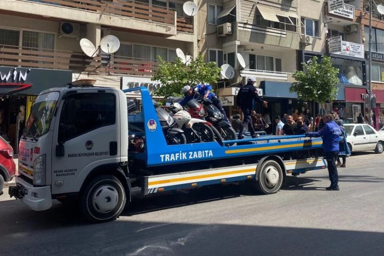 MANİSA (İGFA) - Manisa Büyükşehir Belediyesi Zabıta Dairesi Başkanlığı ekipleri ile Ulaşım Dairesi Başkanlığına bağlı trafik zabıta ekipleri, Emniyet Müdürlüğü ile müşterek çalışma yaparak, şehir merkezinde sorumluluk alanında yer alan cadde ve sokaklarda kaldırım işgaline neden olan ve dükkan önlerine gelişigüzel bir şekilde bırakılan motosikletlerle ilgili işlem yaptı.
